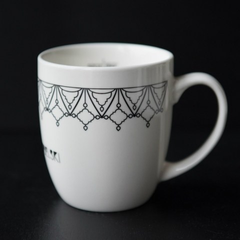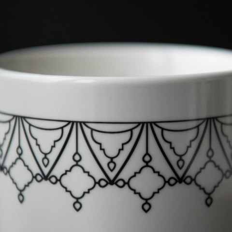 Ozdobiony od góry “koronką”- dekoracyjnym wzorem okalającym obwód kubka.